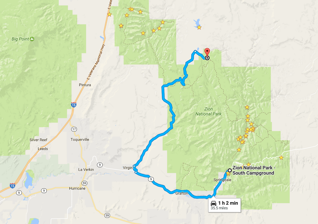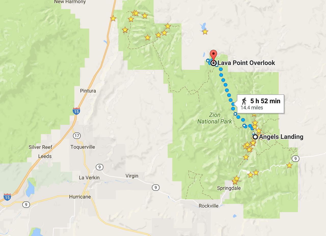 어제 갔었던 Angels Landing 에서 등산으로 Lava Point 에 갈 수도 있다. 8시간을 계속해서 오르막을 가야하는 험한 코스이다. (아래 지도에 6시간으로 나온건 오르막을 계산하지 않은 것.)