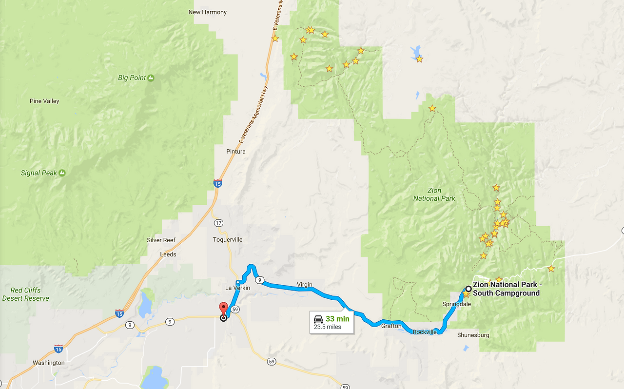 아침 7시에서 8시 사이에 (계절마다 다름) 체크인을 시작하고 선착순으로 입장하기 때문에, 전날 저녁에 가장 가까운 마을인 Hurricane 에 있는 Walmart 에서 노숙을 하고 새벽에 캠핑장으로 들어온 것.