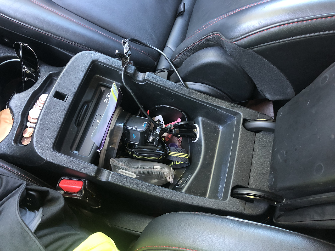 먼저, 운전석과 조수석 사이 콘솔박스에는 가장 자주 쓰는 물건들을 넣어둔다. 헤드라이트, 고프로, 폼클랜징, 로션, 선블럭, 충전케이블, 간단공구 등.