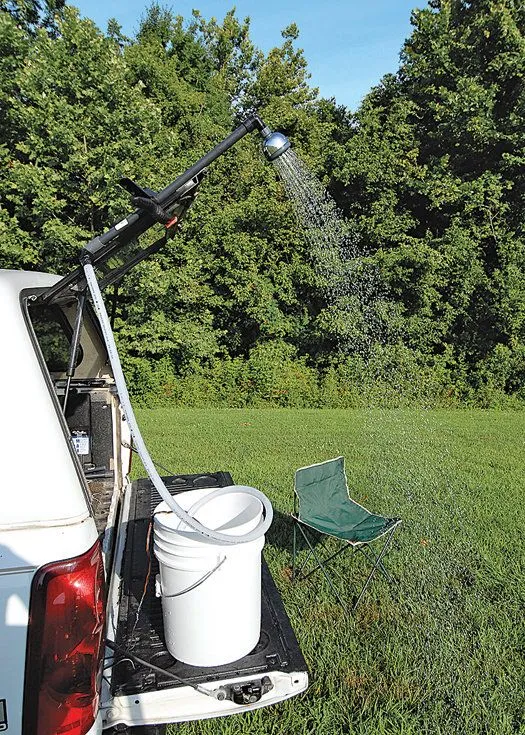 당연히 차 안에 샤워시설을 구비하는 것은 불가능하고, 야외에 샤워시설을 설치해야 한다.