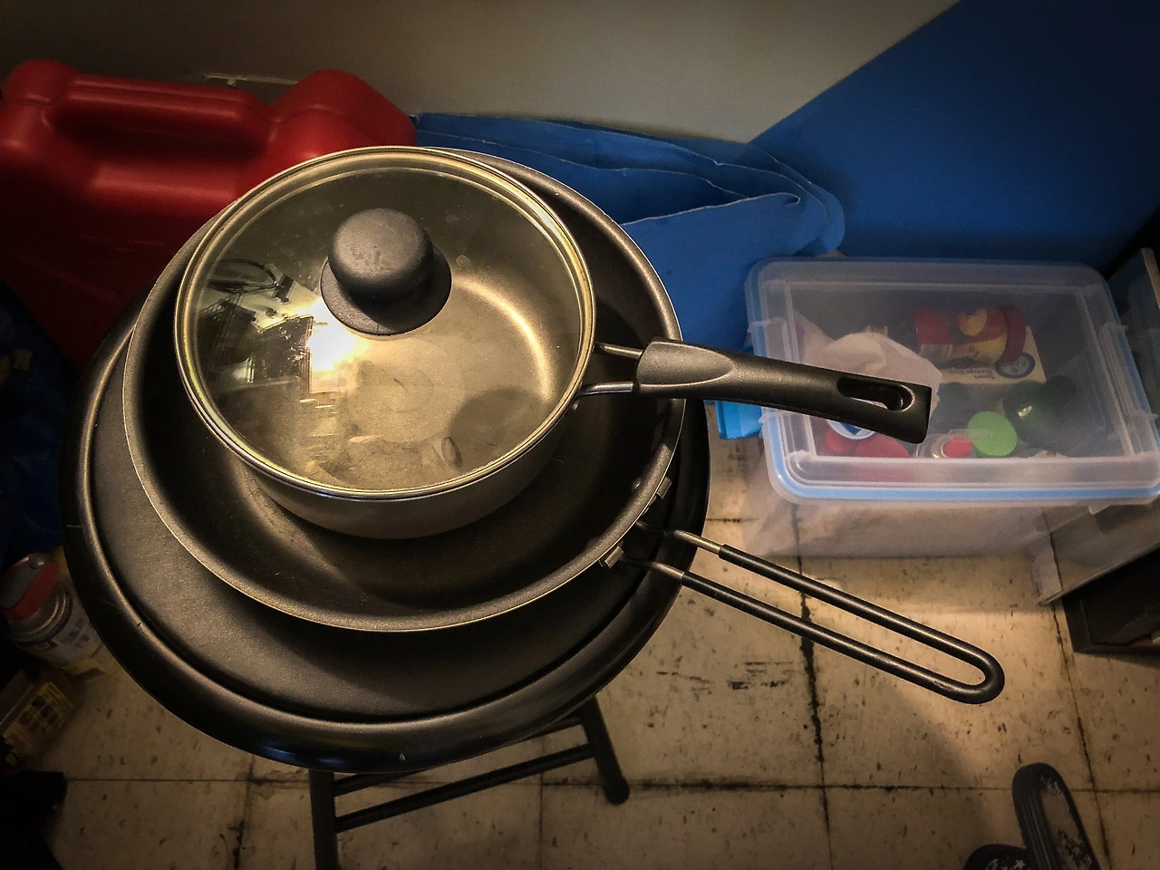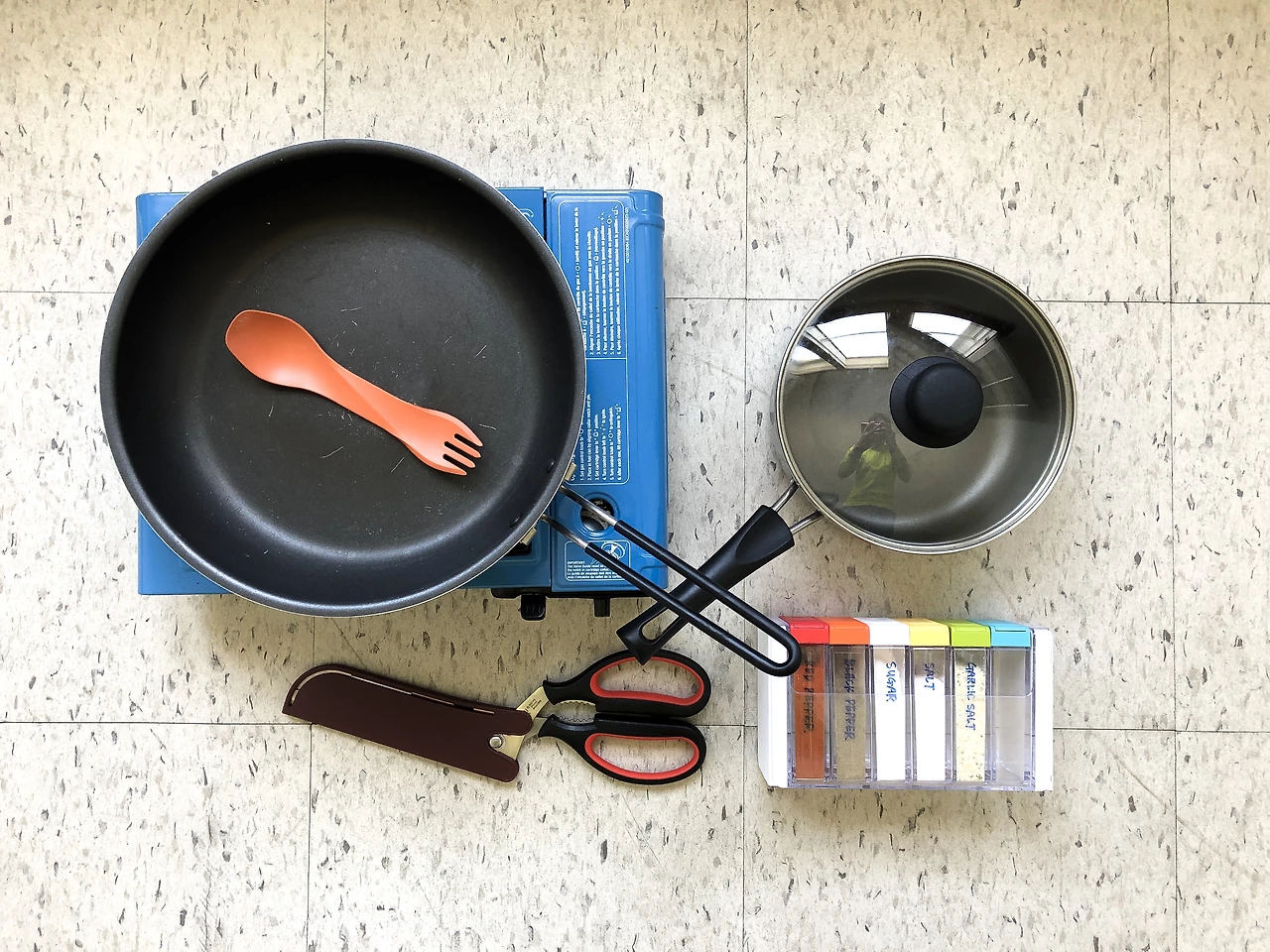 그릇은 냄비 1개, 후라이팬 1개면 된다. 밥그릇? 냄비뚜껑!