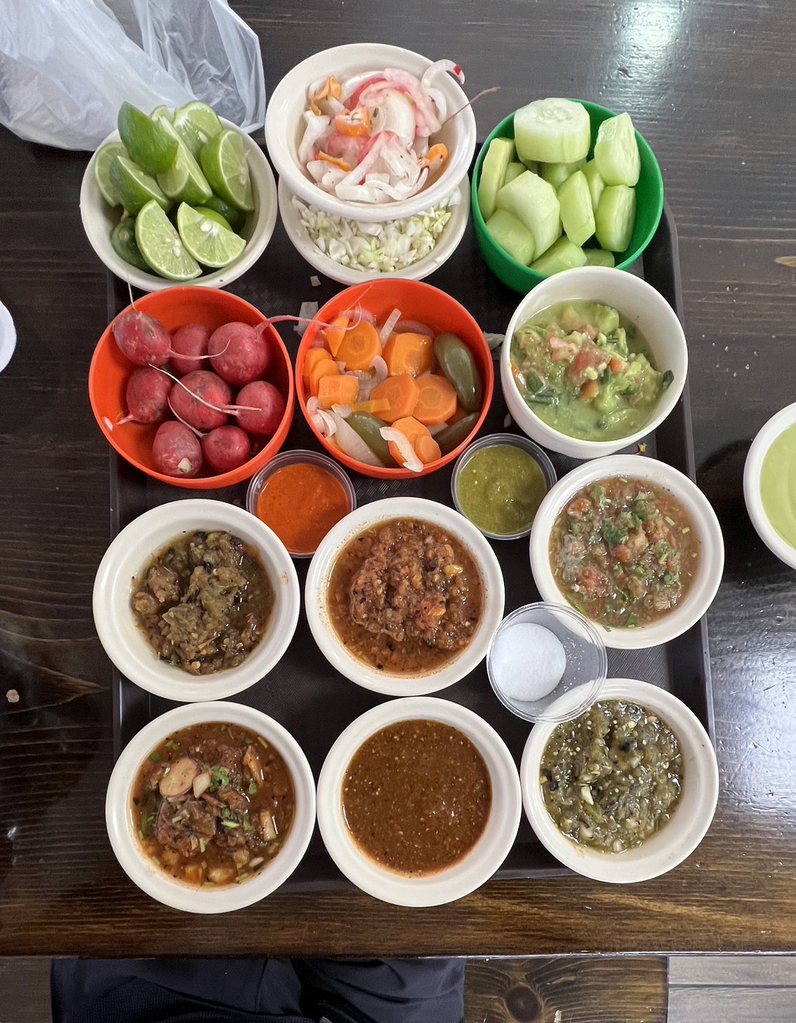타코는 작은 사이즈 톨티아에 알맹이인 고기도 머 그냥 적당히 조금 들어있었지만, 여기에 넣는 부속물들만 한 쟁반을 가져다 준다. 여기엔 각종 소스는 물론 신선한 야채들이 가득 들어있다. 소스도 금방 만든 듯 모두 다 신선했고, 야채도 너무너무 신선했다. 그냥 야채만 씹어먹어도 맛있을 정도.