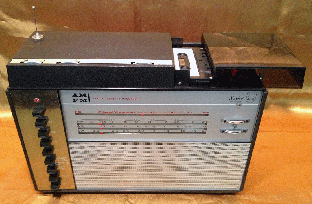 1966년 Philips 사는 최초의 붐박스를 발매했습니다. Norelco 22 RR482라고 불리는 이 모델은 대형 건전지를 넣어서 밖에서도 틀 수 있고 라디오와 함께 카세트테이프의 플레이가 가능했으며 내부적으로 라디오 소리를 카세트에 녹음도 할 수 있었다고 합니다.