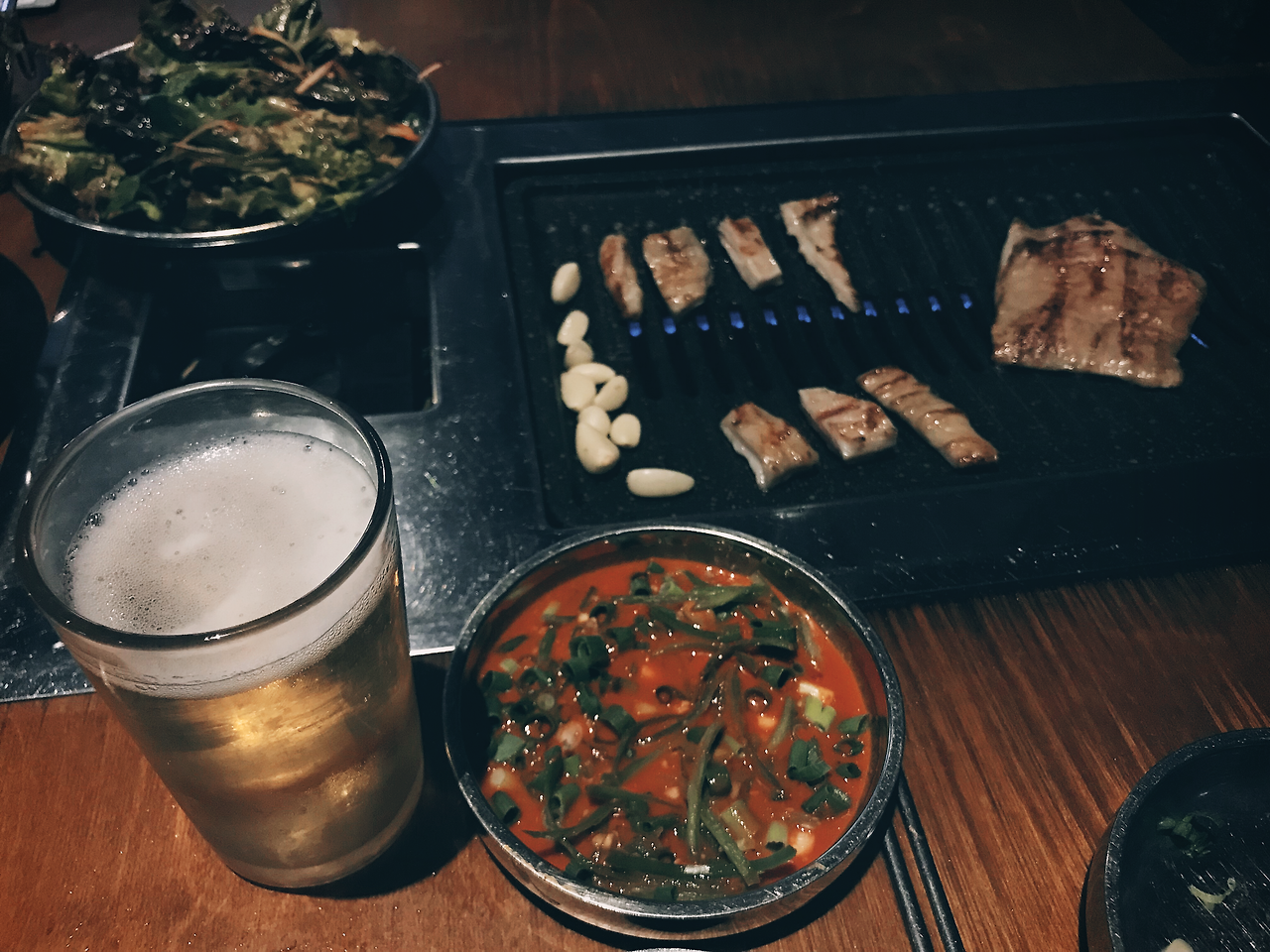 그래서 혼자 먹으러 갔다. 마침 숙소 바로 옆에 사람들이 추천하는 막창집이 있었다. 당당히 들어가서 '한 명이요' 하고 일부러 중간쯤에 앉았다. 에어컨 바로 밑의 구석탱이에 앉기는 싫었다. 2인분을 시켜서 한조각도 남기지 않고 다 먹었다. 맥주도 한 병 깔끔히 비웠다. 막창엔 사실 소주인데. 혼자 여행 와서 만취하면 좀 그러니까 이건 타협하기로.