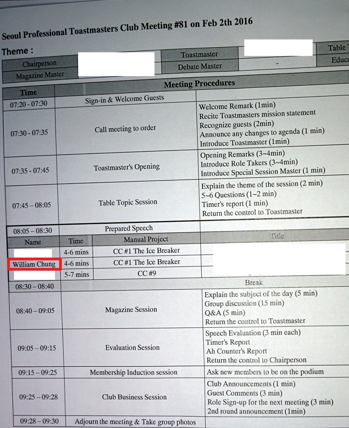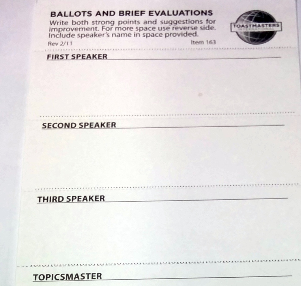 Prepared speech는 1-2주 전에 미리 정해진 발표자의 시간. 레벨마다 다양한 요구 사항이 있다. 어떤 레벨은 다양한 단어를 구사해야 하고, 어떤 레벨은 다양한 목소리 톤을 내야 하고, 어떤 경우는 비주얼 자료를 사용해야 한다. 두 주 간의 구경 후에 나도 신청을 했다. 서로 자원해서 대기자가 줄을 서는 분위기다.