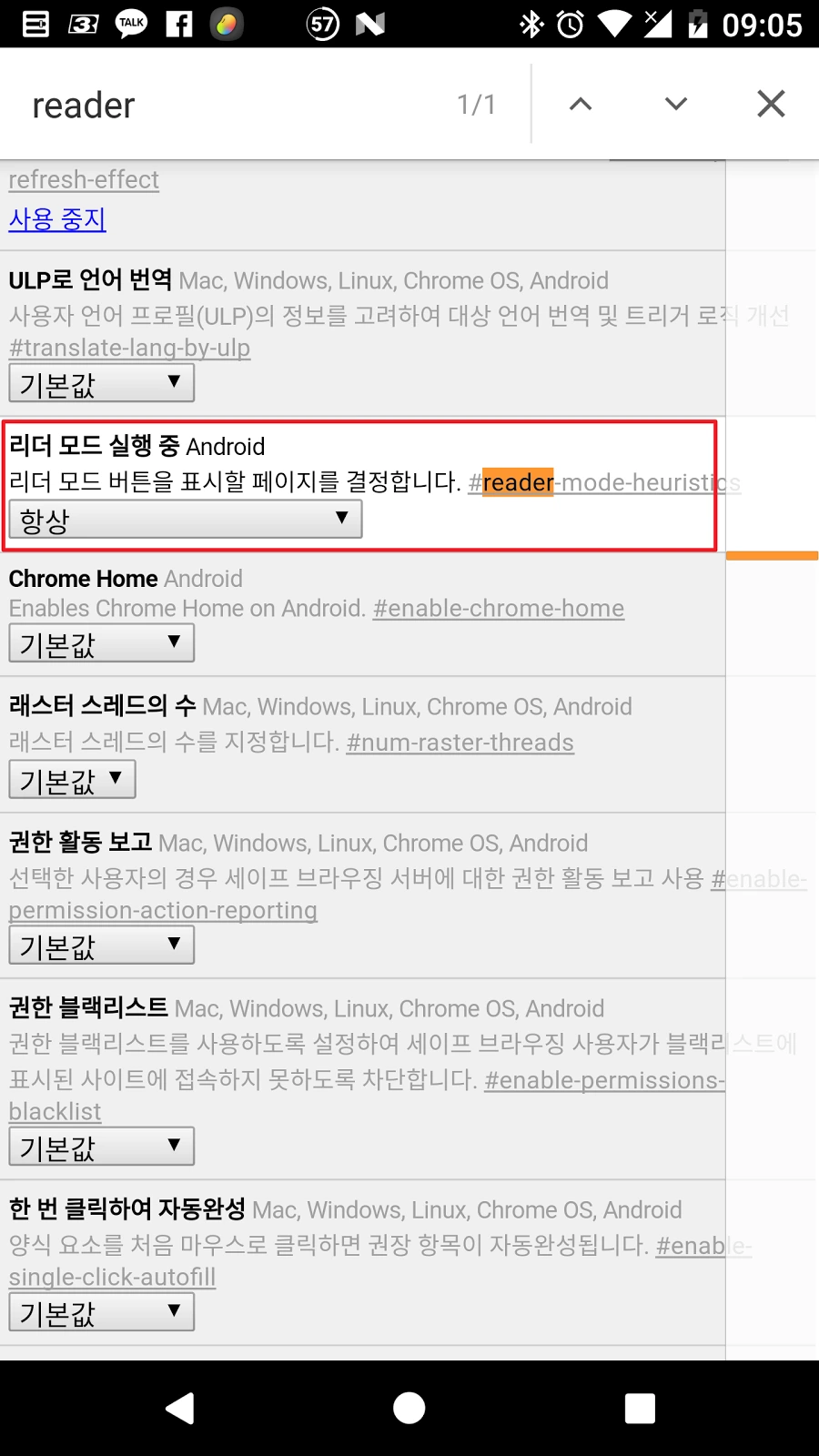 “reader” 혹은 “리더 모드”를 입력하여 “리더 모드 실행 중”의 값을 “항상”으로 바꾸어준다. 크롬을 재시작하면 끝.