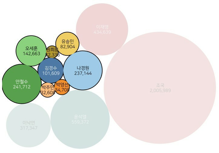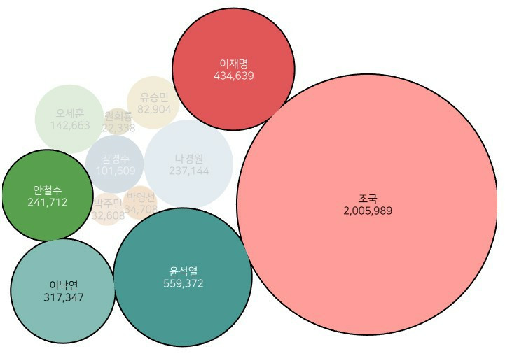 정치부 기자들에게 물어보았다. 받아들이기 힘들다고 한다. 송사에 휘말린 조국 전 법무장관이 어떻게 1등이 나오느냐고 이야기했다. 보수성향 언론인들은 조국이 정치인 1등이라는 현실을 어떻게 이해해야 하느냐고 했다. 보수 주자가 제대로 나타나지 않아서 생긴 일일까. 여러 모로 설왕설래가 오가는 사이 보도자료 형태로 빅데이터 결과가 세상 밖으로 나왔다.