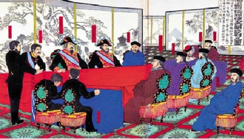 청나라 대표 이홍장과 일본 대표 이토 히로부미 간의 시모노세키 조약.