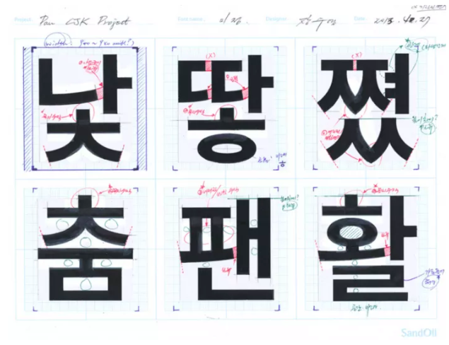 파생되는 글자만 11,172자... 존경합니다 한글 폰트 디자이너(본고딕의 원도 스케치 자료)