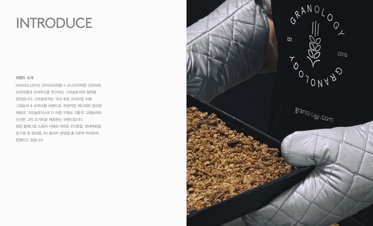 프리미엄 수제 그래놀라를 제조하고 판매하는 그라놀로지에서 6개월 정도 일하게 되었습니다. 그라놀로지는 백화점 5곳과 플래그쉽 스토어 1곳, 총 6곳에서 오프라인 위주로 판매가 이루어지고 있었습니다. 그래픽 작업뿐만이 아니라 브랜드의 이미지에 관련된 모든 작업들을 제가 직접 디렉팅 하며 작업에 임하게 되었습니다.