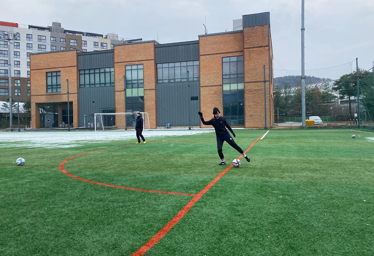 올 겨울 폭설 뒤 아직 눈이 남은 축구장에서 정기 훈련 전. 눈이 오나 비가 오나 공을 찬다, 고 회장님은 말씀하셨다. 언니들의 열정 앞에서 난 성냥개비에 불과하다.