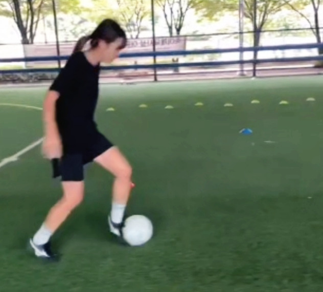 지난여름의 아웃사이드 드리블 연습. 왼발잡이라서 왼발로 공을 치고 나가고 있다. 사진보다 발을 더 눕히는 게 정석이다.