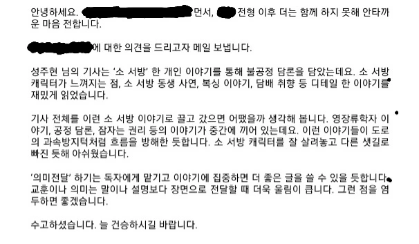 다시 생각해보니, 간절함이 지나쳐 불합격을 한 것 같습니다. 불합격 통보를 받은 뒤, 안타까운 마음에 부족한 점을 여쭈었습니다. 하루가 지나고 답변이 돌아왔습니다. 바쁜 시간을 쪼개 정성스러운 말씀을 전해주셨습니다.