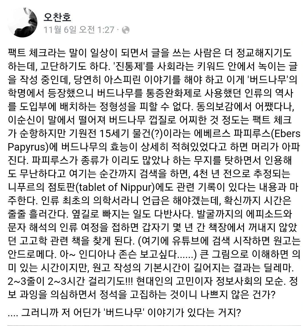 학자라고 다를 것은 없나 보다. 이틀 전, 오찬호 교수가 SNS에 글을 하나 올렸다. '진통제'를 키워드로 사회를 바라보는 글을 쓰는 중인데, 아스피린-버드나무-동의보감-이순신-파피루스-문자 해석 역사-고고학까지 날아간다고 애교 섞인 푸념을 늘어놓았다.