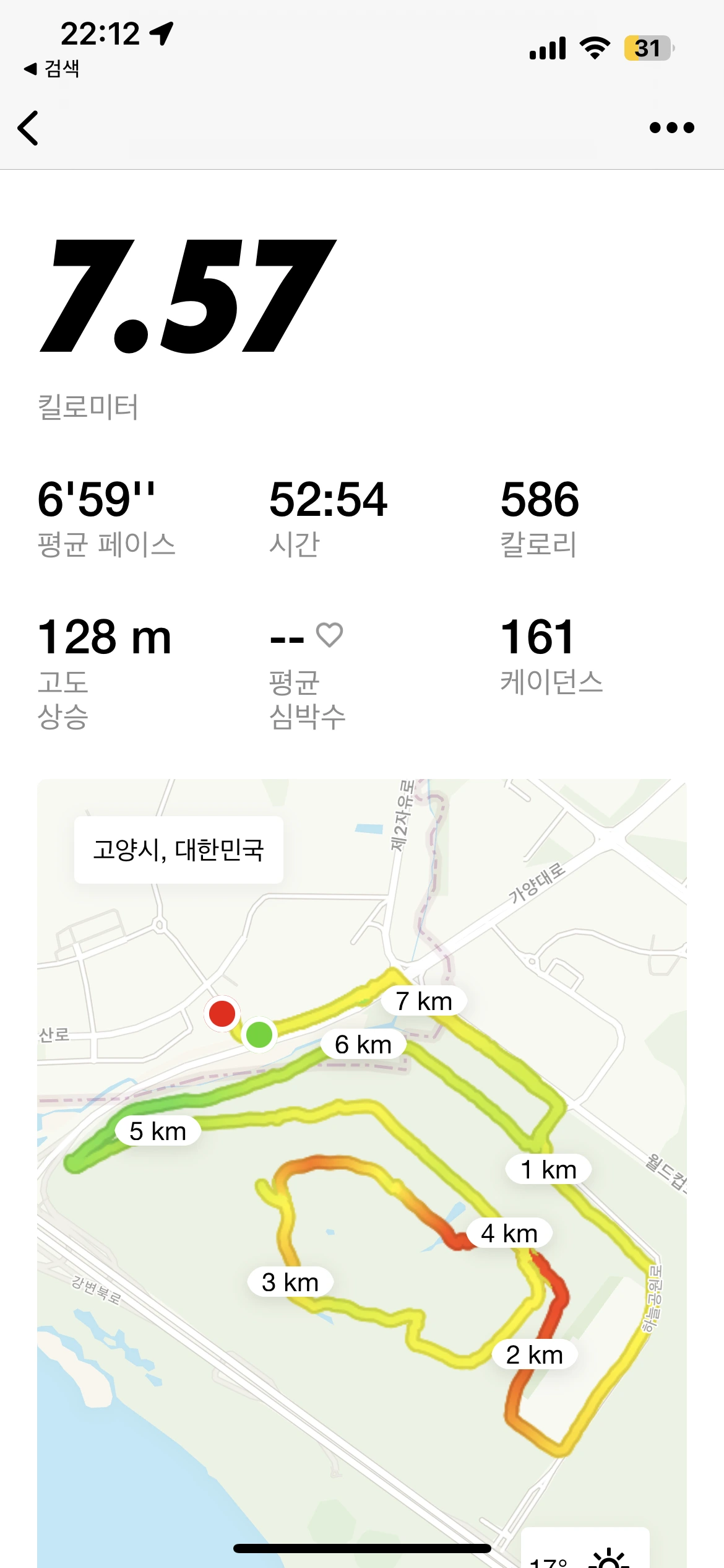 실은 더 뛰었을텐데. 오르막길에서 꺼두고 걷고, 쉬면서 걷고 해서 기록이 7.57km이다. 아빠 인생에서 이만큼 많이 뛰어본 적이 없을 거야. 누구는 우습게 뛰겠지만 뛴 기록만 해서 52분이나 됐어. 너무 뿌듯했어. 노을공원 코스도 너무 좋았고. 노을공원 아주 오래 전에 페스티벌 때 한번 가본 기억이 있는데 정말 좋더라. 이 좋은 계절에 혼자 뛰니까 엄마랑 딸에게 조금은 미안하더라. 언제 같이 올까.