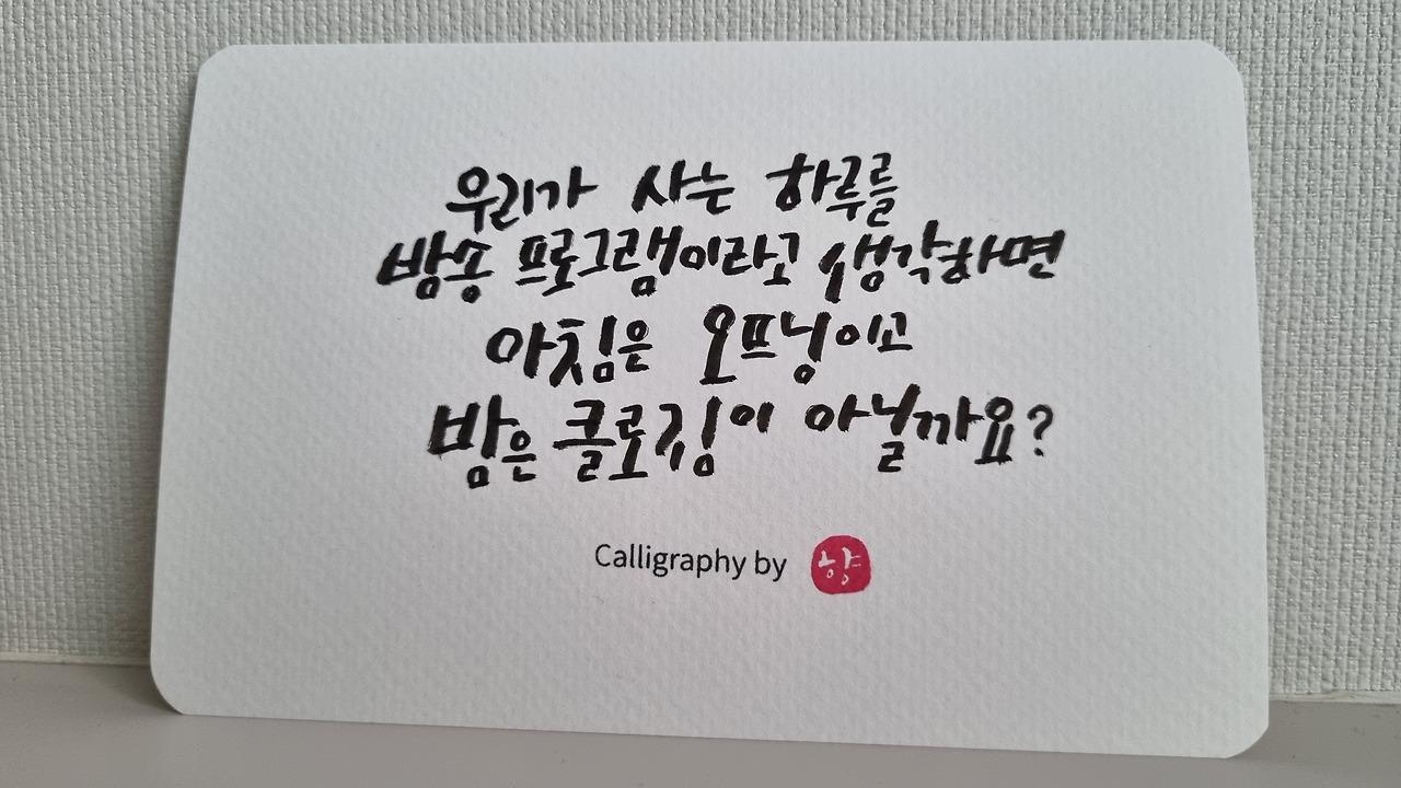 그래서 단순하게 제목도 <박작박작한 오프닝&클로징> 입니다. 스트레스 해소를 위해 배웠던 캘리그래피도, 비록 초보자이지만, 묵히지 않고 활용해 보렵니다. 누군가 아침 출근길에 제가 쓴 오프닝을 보고, 하루를 힘내서 시작하면 좋겠습니다. 어수선하면 어떨까요? 활기차면 그만이지요!