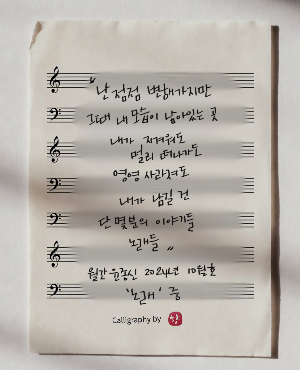 음(音) 위에 얹힌 그의 얘기를 들으며 글을 씁니다. 그가 노래를 사랑하는 만큼, 글을 사랑하는 마음으로요! 말보다 노래가 더 좋다는 그처럼, 말보다 글이 좋아 글 안에 전하고 싶은 마음을 차곡차곡 적어 내려갑니다. 그의 진심이 노래에 있는 것처럼 제 진심도 글에 다 있습니다.