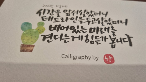 요즘 저의 시간은 딱 일주일쯤 앞서갑니다. 브런치 글을 한주 분량씩 쓰고 있거든요. 점검의 시간도 필요하고, 캘리그래피도 해야 하니까요. 미리 준비되어 있지 않으면 너무도 불안합니다. 날짜가 정해진 방송도 아닌데 말이지요.