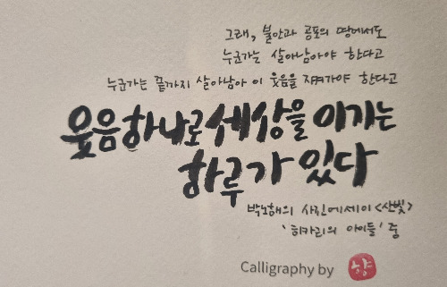 아주 강렬한 마지막 한 줄만 남길까 하다가, 도대체 이렇게 거대한 한 줄 앞엔 어떤 글귀가 자리 잡고 있을지 궁금하실 것 같아서 조금 길게 남겨봅니다. 마지막 줄을 읽은 순간 머리가 아주 띵~ 했거든요. 그리고 그렇게 대단한 웃음을 마주한 적이 있었나, 떠올려봤습니다.