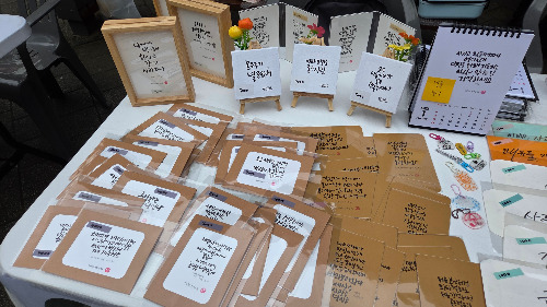 태어나 처음으로 참여한 플리마켓인데 작품을 하나도 못 팔아서 속상하냐고요? 전혀요. 동기들과 아주 실컷 웃으며 이야기를 나눴고, 비록 구경뿐이었지만 감격스러운 말도 들었습니다. “어머나! 직접 쓴 거구나, 인쇄한 줄 알았네!”