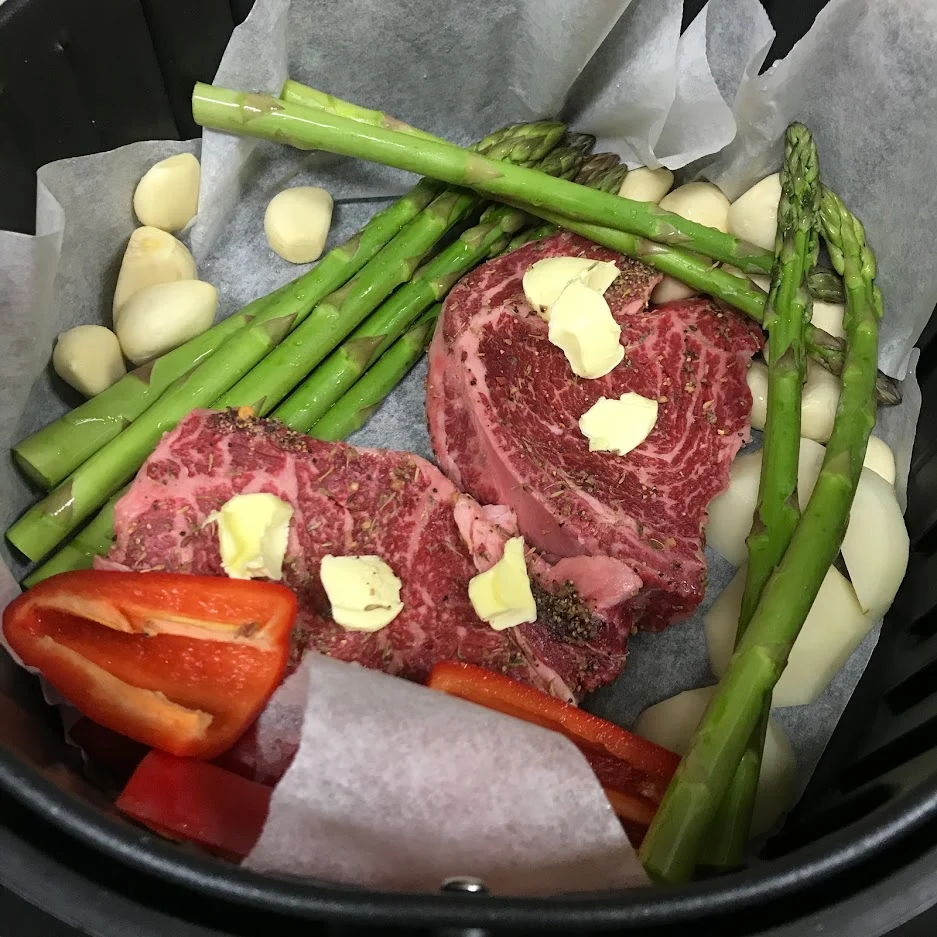 숙성시킨 고기를 냉장고에서 꺼내 에어프라이어 바구니 속 종이호일 위에 두고 버터를 똑똑 잘라 3조각 고기 위에 던진다
