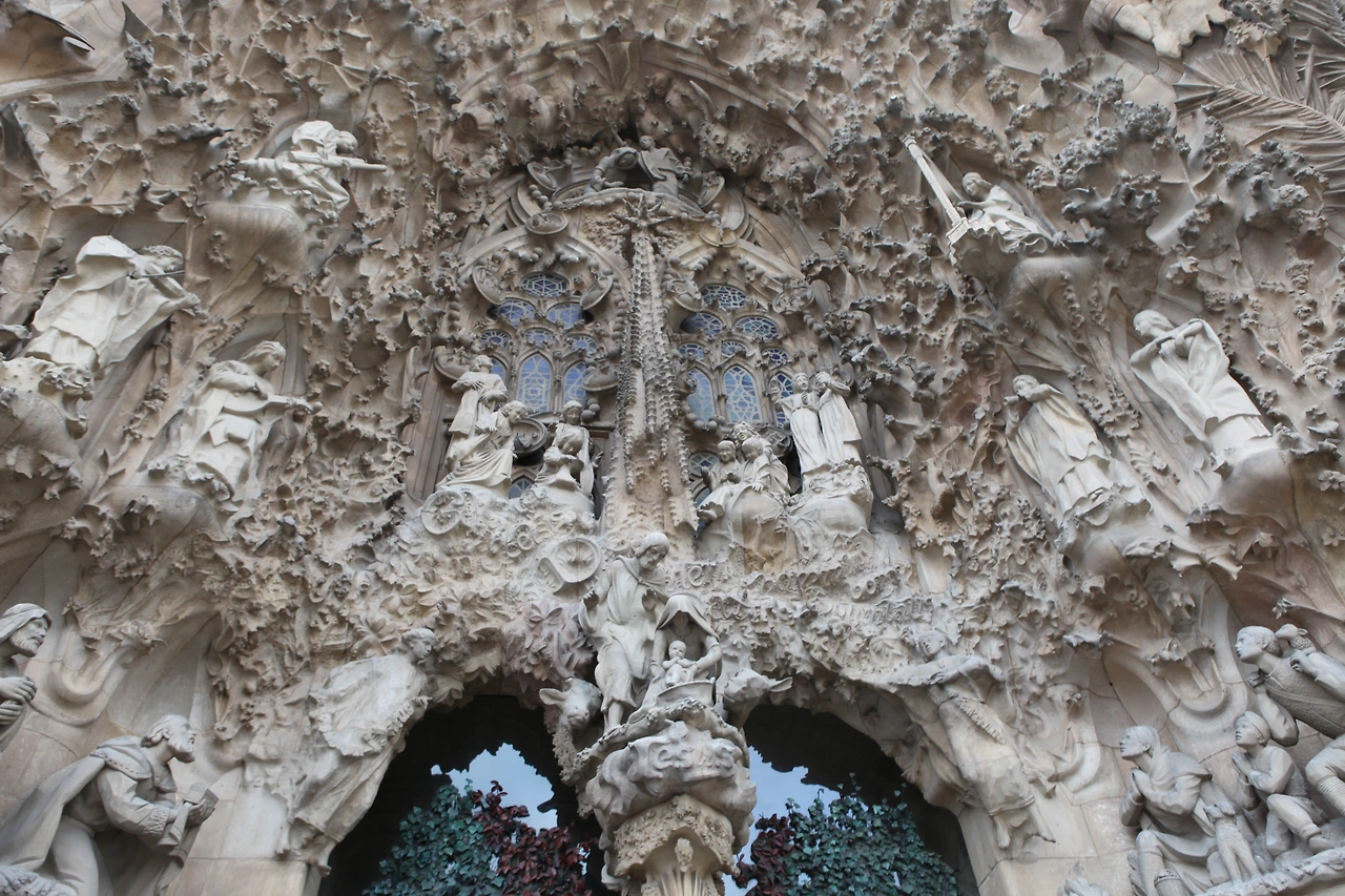 많은 조각가와 장인들의 손을 빌려 가우디가 연출한 탄생의 파사드가 수태 고지로 시작해 수난받기 전 예수의 삶을 조각으로 들려줍니다.