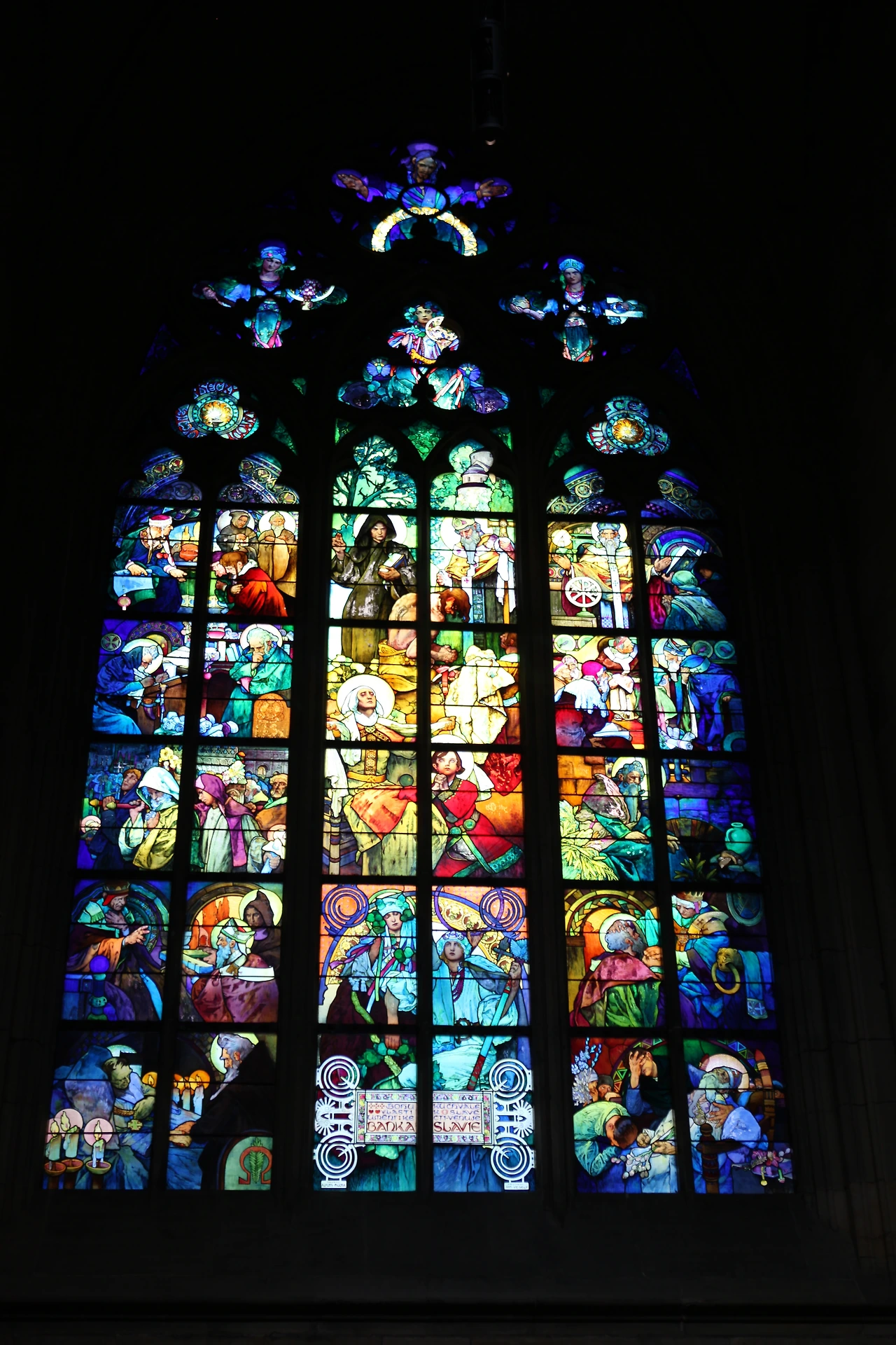 체코 출신 화가 알폰소 무하 (Alfons Mucha 1860~1939)가 그린 비투스 성당의 스테인드 글라스에도 마법이 걸려있을지도 모릅니다. 발걸음을 옮겨야 하는데 발이 떨어지지 않았으니까요. 익숙한 모자이크 스테인드 글라스가 아니라 새롭습니다. 아름다운 여인들을 그려내던 화가의 붓길을 따라가다 눈이 멀지도 모릅니다. 숨 넘어가게 아름다운 스테인드 글라스 창이 4개나 되다 보니 성화가 담고 있는 이야기를 들으며 하루를 이곳에서 다 보낼 수도 있지요. 아래쪽에 제작을 지원한 회사들을 깨알같이 홍보하고 있는 세상에서 가장 성스러운 광고판 스테인드 글라스를 놓치지 마세요.