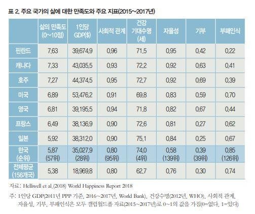 2018년 보고에 따르면 핀란드를 필두로 북유럽국가들이 최상위에 랭크됐다. 2017보고서에는 노르웨이가 1위, 2016년 조사에는 행복한 나라 1위로 덴마크가 오르는 등 북유럽국가들 간 ‘행복한 수위경쟁’을 펼치고 있다. 앞서 말했듯이 한국은 올해 57위다. 작년(2017)은 56위였으며, 2016년은 58위로 비슷한 순위를 맴돌고 있다. 이 중에서도 특히 사회적 지원(95위), 투명성(126위), 자율성(139위) 등에서 점수가 낮아 그렇다(아래 표를 참조하라).