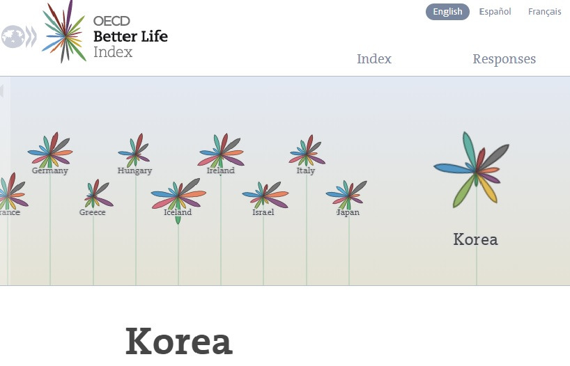 한국인들은 또한 '삶의 전반적 만족도'를 0에서 10점으로 평가할 때 OECD 평균인 6.5보다 낮은 평균 5.9등급을 주었다(38개국 중 30위).