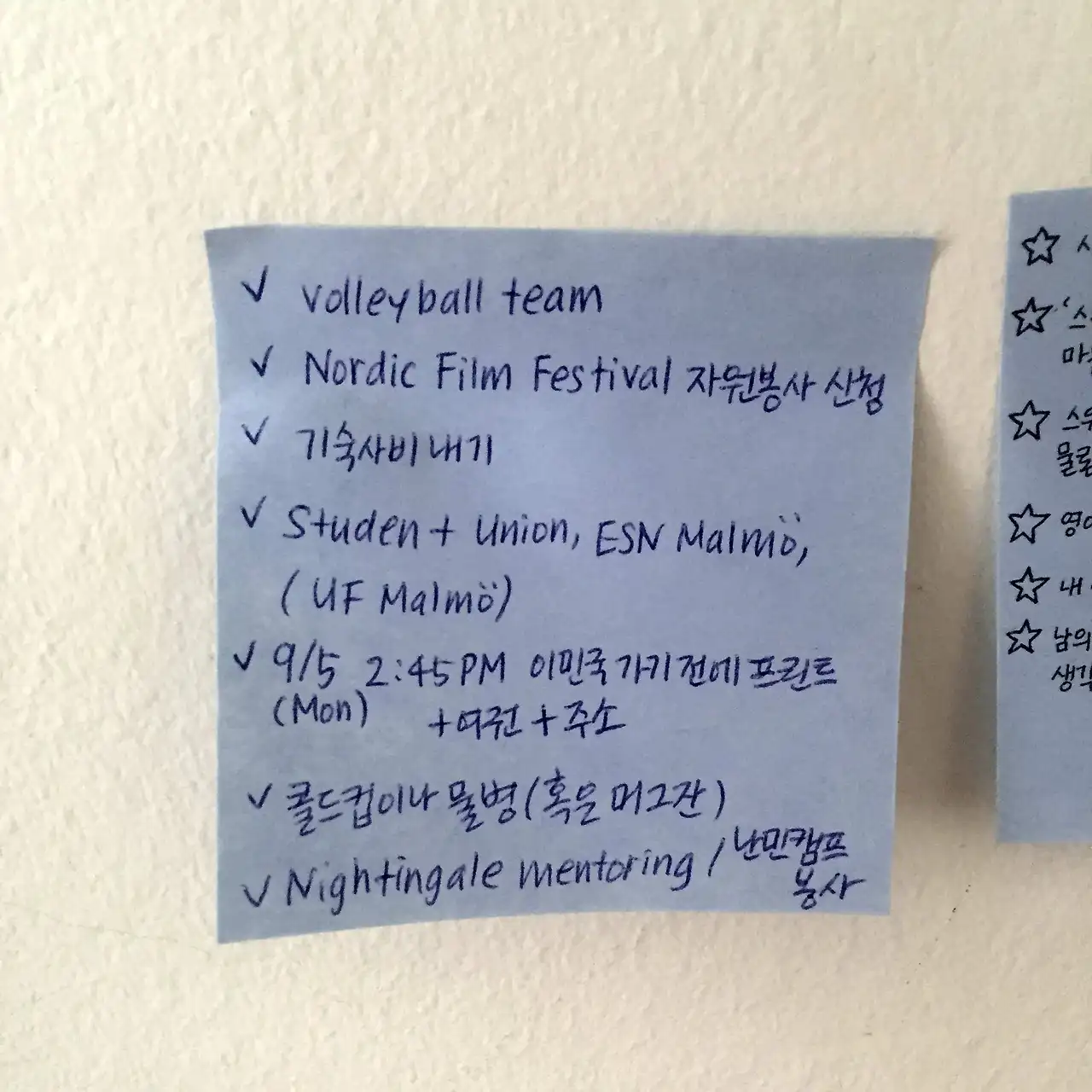 거실 문 앞에는 열 명이 사는 복도가 펼쳐져 있다. 3층 출입문 가까이에 있는 왼편 벽에는 우리 층 친구들의 우편함이 붙어 있다. 지난 3주간 편지를 기다리며 주말을 제외하고는 정말 매일 열어본 것 같다. 키가 큰 북유럽 친구들의 영향인지 내게는 우편함이 너무 높다. 요즘 우편함을 여는 열쇠가 여는 곳의 끝까지 잘 안 들어가는데 그럴 때마다 까치발을 하고 목을 치켜올린 상태가 꽤 오래 지속돼 매우 힘들다. 버텨보는데도 열쇠가 안 들어가면 짜증을 내면서 결국 잠시 쉬어가기로 한다. 신체적 고난을 넘어서서 우편함을 열었는데도 편지가 없어서 허무했던 지난 3주였는데 오늘은 드디어 하얀색 봉투가 날 반겨줬다. 옆에서 지나가던 데비가 말한다. 내 우편함을 열었는데 편지가 와 있어서 너무 신났어. 그런데 자세히 보니까 코리아라고 쓰여있는 거야. 9랑 7을 헷갈려서 9에 넣었나 봐. 그래서 내가 다시 네 우편함에 넣어뒀어. 고마워 데비야. 편지는 J가 보낸 거다.