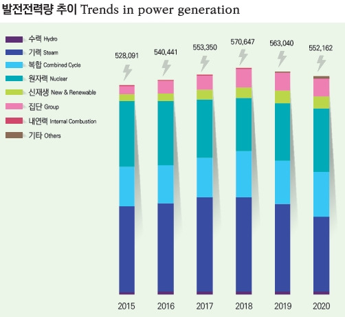 2021년 한국전력통계를 보면 화석연료를 사용하는 화력발전이 63%, 원자력발전이 29%로, 결국 화력과 원자력이 전체 발전량의 92%에 달하는 것으로 보인다.