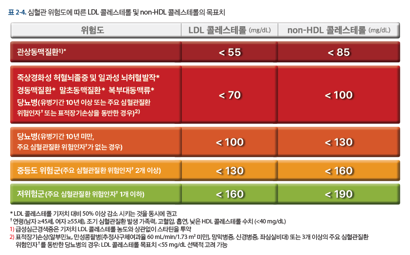 우리나라의 LDL 치료목표는 심혈관질환 위험인자에 따라 다릅니다. 심혈관질환 위험이 아주 높은 환자들의 LDL을 극단적으로 낮췄을 때, 재발률이 현저히 줄어든다는 것이 증명되었기 때문입니다.