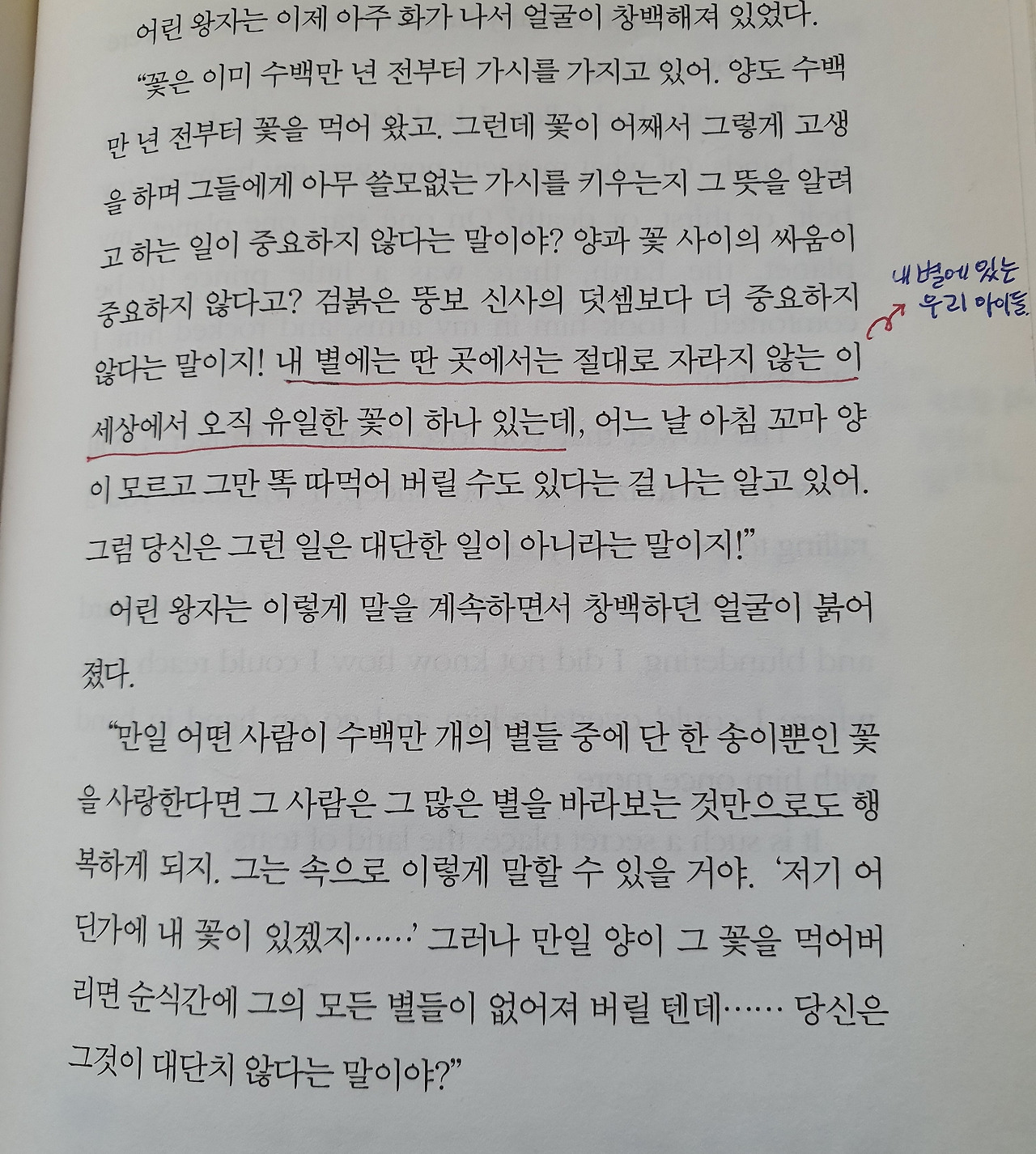내 마음을 흔들어 놓은 두 번째 구절은 ‘내 별에는 딴 곳에서는 절대로 자라지 않는 이 세상에서 오직 유일한 꽃이 하나 있는데, 어느 날 아침 꼬마 양이 모르고 그만 똑 따먹어 버릴 수도 있다는 걸 나는 알고 있어.’ 다. 그렇다. 이 우주, 지구 어디에도 없는 소중한 존재는 내 아가들이다. 소중한 아이들이라는 것을 화에 휩싸이면 잊곤 했다. 어린 왕자와 장미꽃의 관계가 나와 아이와의 관계 같았다. 어린 왕자가 장미를 키우면서 사랑을 배울 수 있었던 것처럼 말이다.