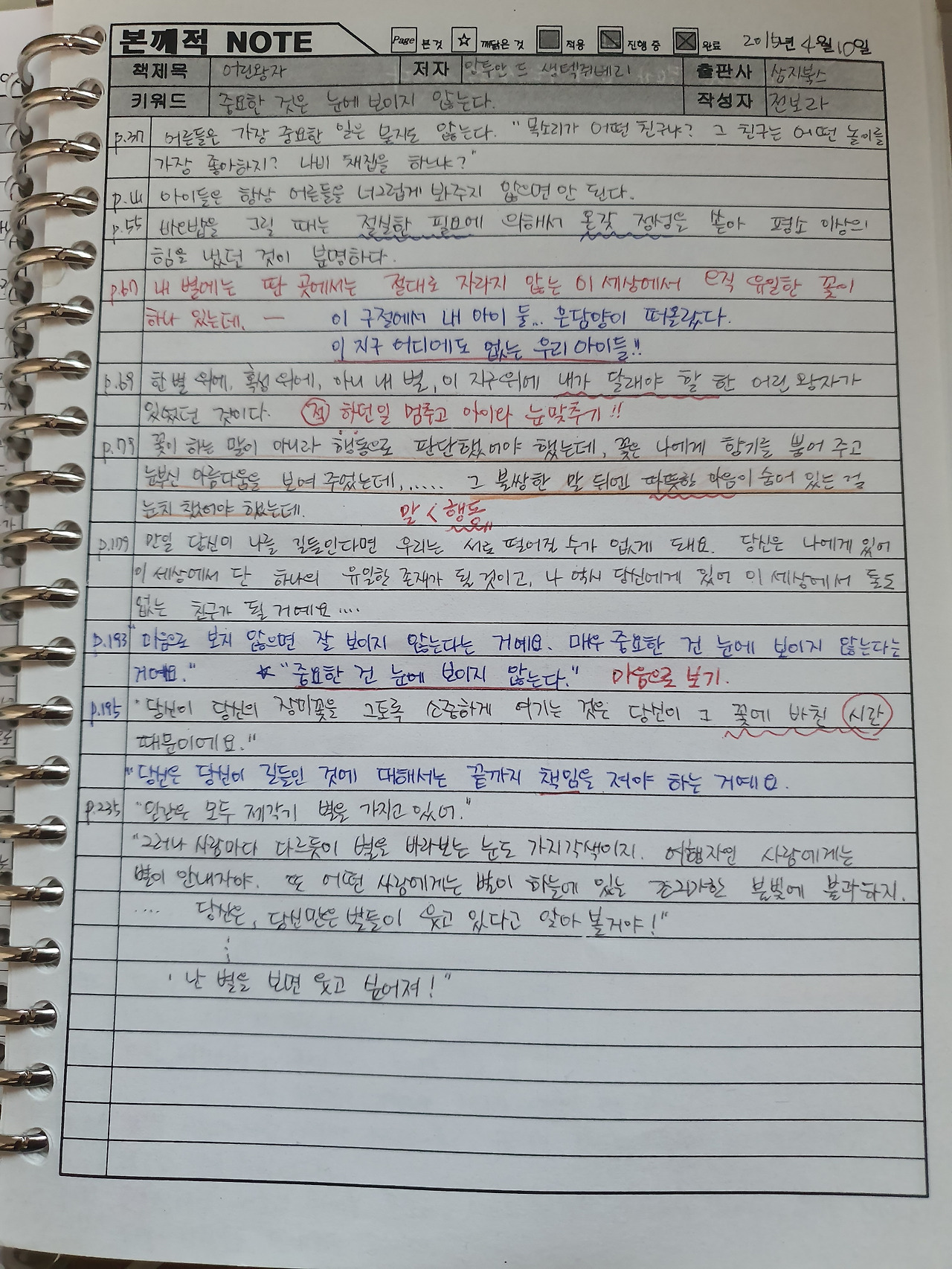 책을 읽고, 책에 관한 질문을 던지고 나름의 답을 생각해 본다. 4년 전의 질문들에 지금은 새로운 답을 할 수 있는 내가 되어간다. 책 속 한 줄이 위로를 해줬다는 것을 안다. 책을 읽고, why를 쓰고, 할 수 있는 아주 작은 것들을 실천하는 것이 내가 할 수 있는 일이었다. 아이와 눈 맞추기! 오늘도 사랑한다고 말해줘야겠다. 그럼 된 거다. 내가 사랑해야 할 어린 왕자, 은이 담이♡