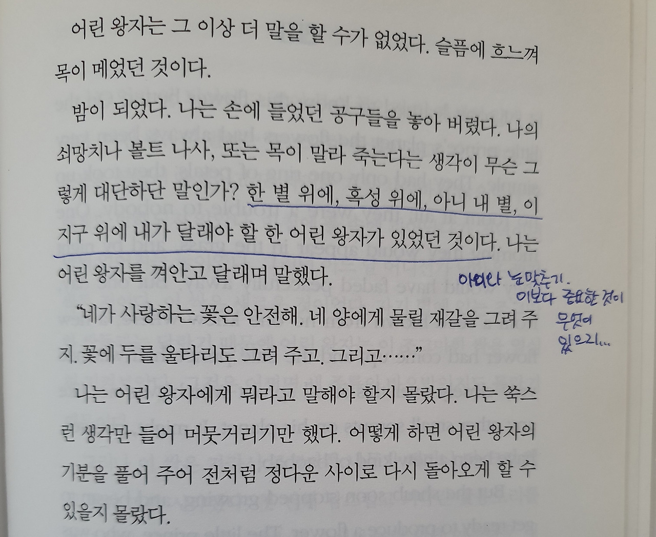 그리고, 적용할 것을 찾을 수 있는 구절을 만났다. ‘한 별 위에, 혹성 위에, 아니 내 별, 이 지구 위에 내가 달래야 할 한 어린 왕자가 있었던 것이다. 나는 어린 왕자를 껴안고 달래며 말했다.’ 이거구나! 지금 이 지구에서 내가 할 일이었다. ‘아이를 기르는 일’이다.