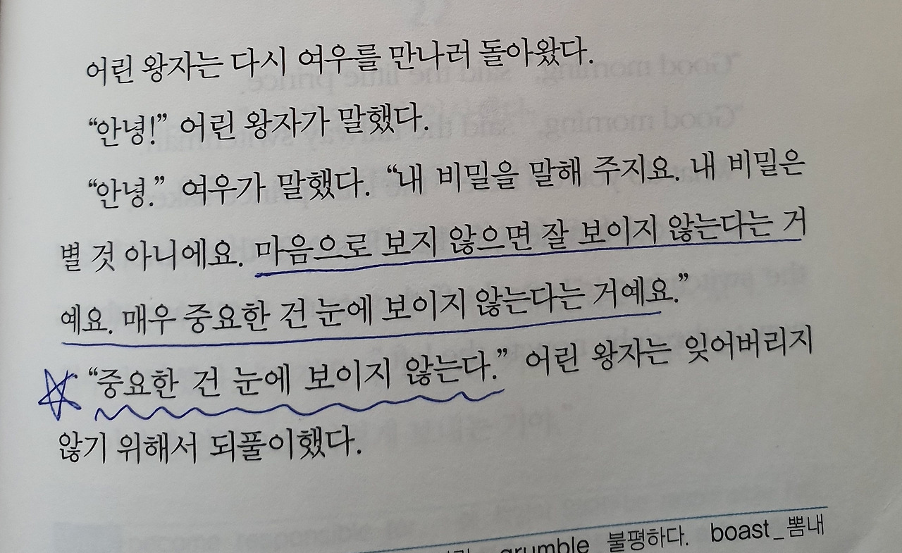 눈길을 끌었던 첫 구절은 ‘어른들은 가장 중요한 일은 묻지도 않는다. “목소리가 어떤 친구냐? 그 친구는 어떤 놀이를 가장 좋아하지? 나비 채집을 하느냐?”’였다. 세상에나! 아이들의 마음을 몰라서 답답했던 내게 책은 대답해 주었다. 아이에게 중요한 질문을 하라는 것이다. 내 관점에서만 아이를 보려 하니 당연히 이해할 수 없는 행동들 뿐이었다. 그리고 ‘묻지 않는다’는 것이다. 아이와 대화를 하려면 상대인 아이의 눈높이에서 물어봐야 한다는 것이다. 육아서보다 더 육아서 같은 내용에 계속 밑줄을 긋고 있었다. 긋지 않을 수 없었다.