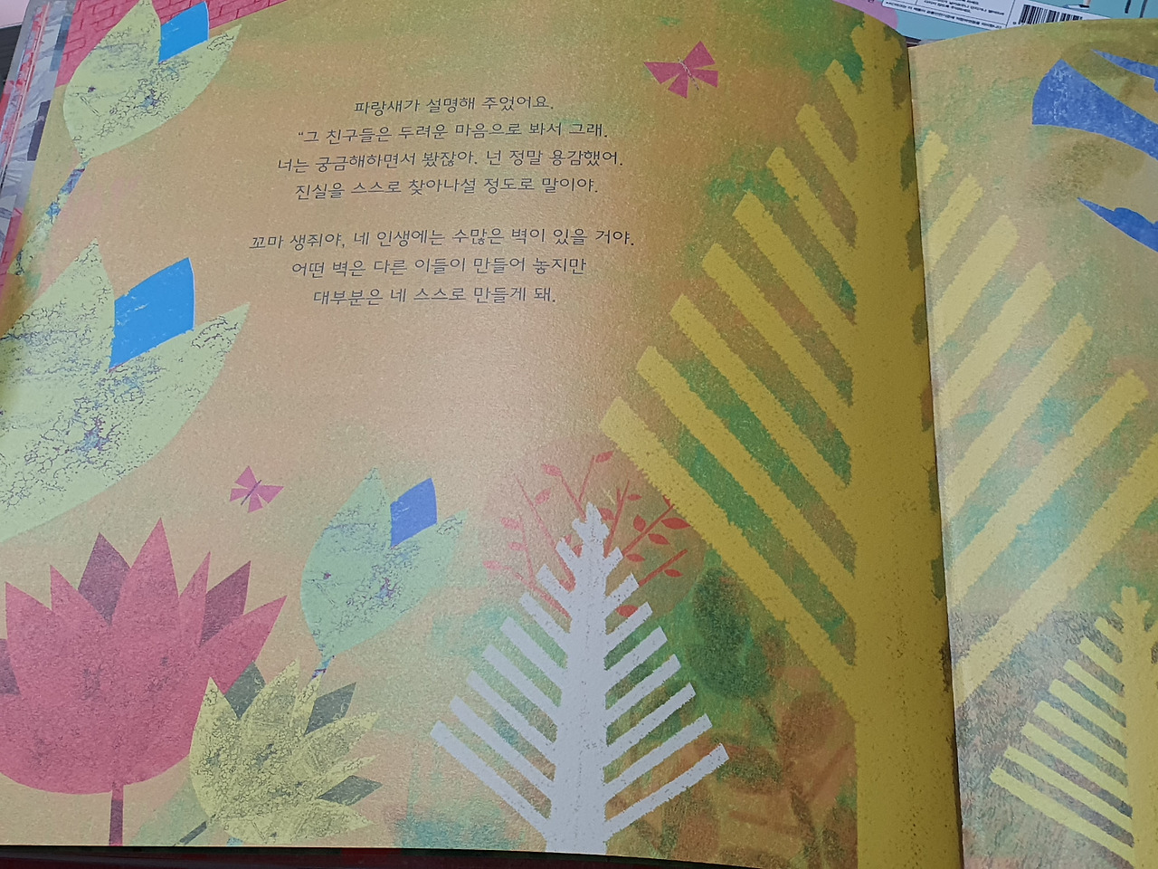 계속 답을 구하는 자에게는 스승이 나타난다. 바로 파랑새다. 꼬마 생쥐에게 기꺼이 등을 내어주는 새는 처음부터 빨간 벽은 없다고 말해 준지 않는다. 꼬마 생쥐가 세상이 궁금하다고 자신을 벽 너머로 데려다 달라고 했을 때 슬그머니 등을 내어 준다. 그리고 꼬마 생쥐가 알아챘을 때 비로소 넌지시 말해준다. 벽은 처음부터 없었다고 말이다. 만약 궁금해하지도, 관심도 없는 사람에게 진실을 계속해서 말해준다고 받아들일 수 있을까?