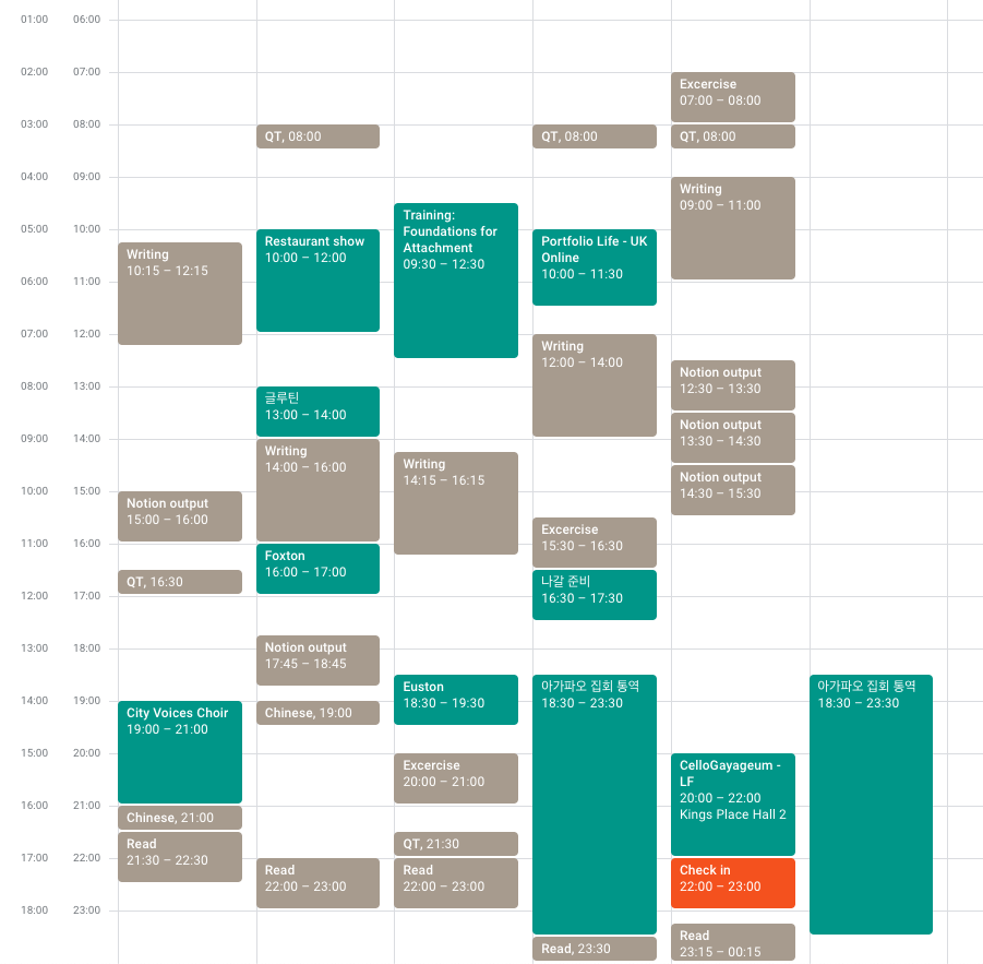 그래서 시작한 게 구글 캘린더와 노션을 이용한 타임청킹(Chunking)과 시각화다.