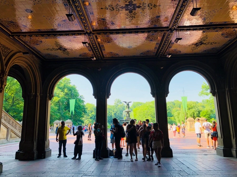 공원에 들어서자 자전거 투어를 하는 남자가 내게 자전거 타지 않겠니? 라 묻는 순간 내 옷에 메트 뮤지엄 입장권이 붙여져 있는 것을 확인하고 얼른 떼었다. 아름다운 호수에서는 보트를 타고 베데스다 테라스 분수대에는 예쁜 연꽃이 피어 있고 베데스다 테라스 안에는 기타 치는 음악가가 미소를 지었다. 기타 연주를 듣고 지나가는 사람이 돈을 주자 장밋빛 미소를 지어. 돈이 좋긴 좋은가 봐.