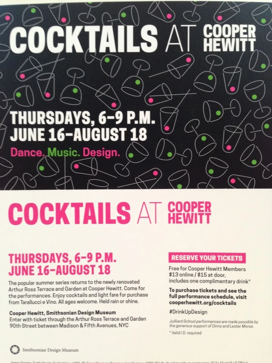 어퍼 이스트사이드에 있는 쿠퍼 휴이트 국립 디자인 박물관에서 칵테일파티가 열리며 칵테일을 마실 경우 티켓을 구입해야 하지만 공연만 볼 경우 티켓을 구매하지 않아도 된다. 줄리아드 학교 학생 재즈 공연 등을 감상할 수 있어서 정말 좋고 뉴요커가 사랑하는 여름 축제에 속한다.