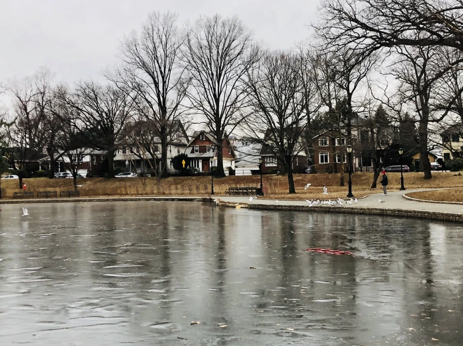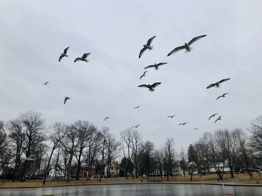 추운 겨울날 아침 아들과 함께 호수에 산책하러 갔어. 갈매기떼 호수 위를 날고