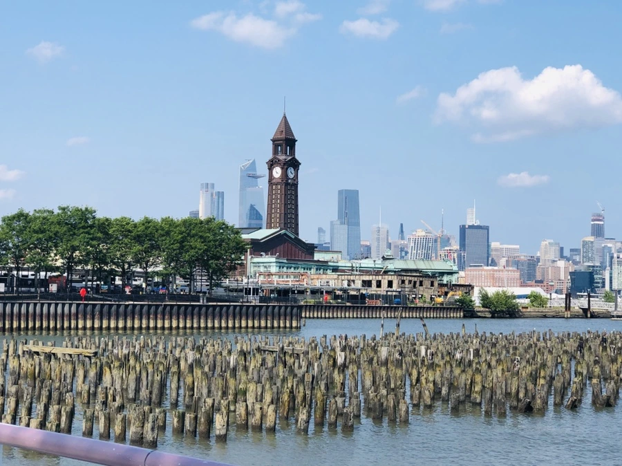 잠시 기다리다 페리에 탑승해 뉴저지 Jersey City에 도착했다. 우리의 목적지는 호보켄. 맨해튼에서 호보켄까지 뉴저지 패스를 타면 2.75불을 내고 갈 수 있다고 했는데 뉴저지 지하철 탑승권을 사야 한다고 하니 기분이 언짢았다. 페리에서 내린 곳은 뉴저지 패스 타는 곳과 약간 떨어져 있다는 것을 확인한 뒤 뉴저지 패스 타는 곳을 향해 걸었다. 저지 시티 NEWPORT 지역이었다. 아들은 높은 빌딩 많은 그 동네가 마치 한국 분위기 같다고 하고. 뉴포트 지하철역에서 메트로카드를 그었는데 환승이 되지 않아 다시 2.75불을 지불했다. 세 명이면 8.25불. 예상에 없던 지출이었다. 지하철을 타고 호보켄에 도착했는데 태양은 작열하고 낯선 호보켄에 대한 호기심은 순간에 사라졌다. 그냥 걸었다. 호보켄 지하철 역 근처를 걷다 모래사장을 발견해 기분이 좋았는데 어린아이들이 노는 놀이터였다. 파도가 출렁이는 바닷가를 거닐고 싶었는데 우리의 기대를 비켜갔다.
