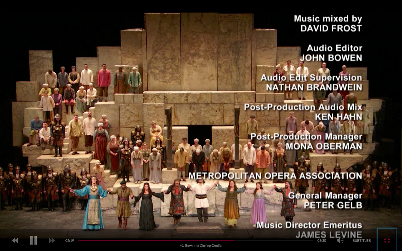 Starring Liudmyla Monastyrska, Jamie Barton, Russell Thomas, Plácido Domingo, and Dmitry Belosselskiy, conducted by James Levine. From January 7, 2017.