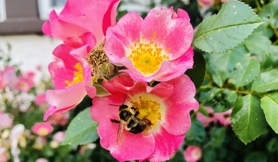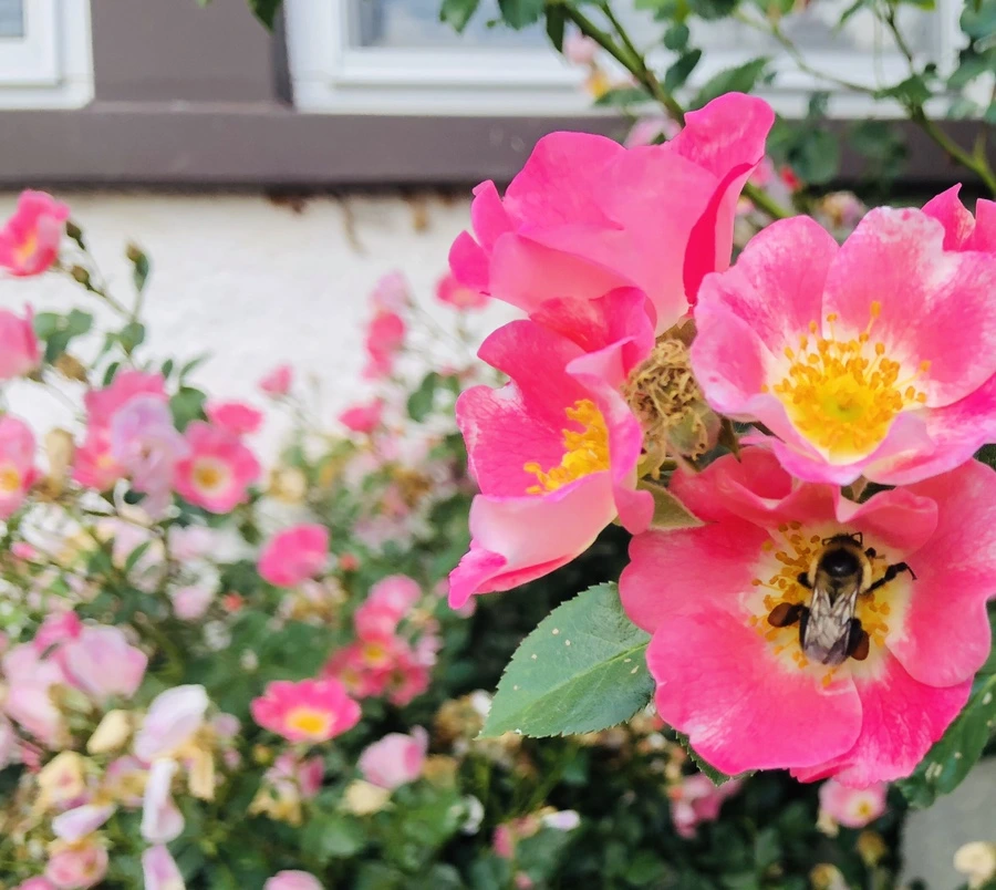 창가에 장미꽃 핀 이웃집 정원에