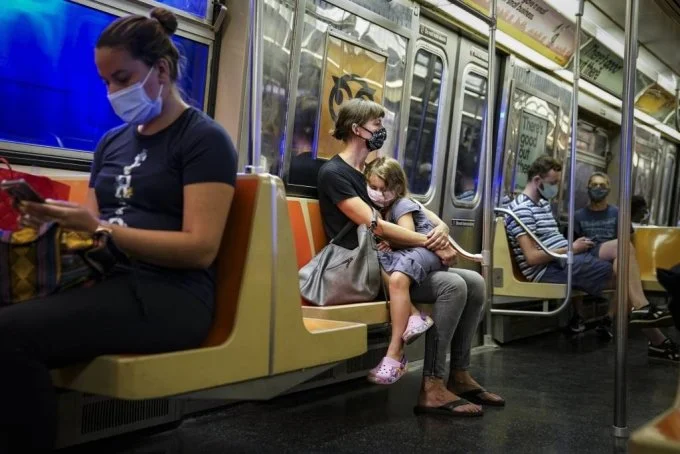 뉴욕의 지하철 안에서 마스크를 쓴 한 여자아이가 엄마의 무릎에 앉아 쉬고 있다. 띄엄띄엄 앉은 승객들 모두 마스크를 착용하고 있다. 지난해까지만 해도 존재조차 알지 못했던 신종 코로나바이러스 감염증(코로나19)이 심장질환과 암에 이어 미국 내 사망 원인 3위에 올랐다고 CNN이 17일(현지시간) 보도했다. 2020.8.18./사진=[뉴욕=AP/뉴시스]