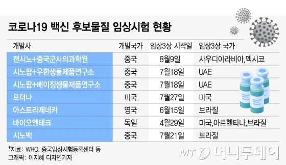 이 가운데 3상 임상시험에 들어간 곳은 △미국 모더나 △영국 아스트라제네카·옥스포드대학 △미국 화이자·독일 바이오테크 △미국 존슨앤존슨 △중국 칸시노 바이오 △중국 시노백 바이오테크 △중국 우한생명과학연구소 △중국 시노팜 △러시아 가말레야 연구소 △호주 머독 아동연구소다. 여기에 24일 미국 생명공학회사 노바백스도 영국에서 코로나19 백신 3상 임상시험을 시작했다고 밝혀 총 11곳이 됐다.