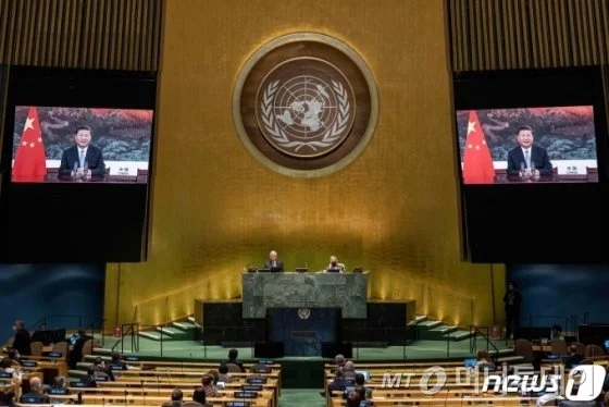(뉴욕 AFP=뉴스1) 우동명 기자 = 시진핑 중국 국가주석이 22일(현지시간) 뉴욕 유엔본부에서 열린 제75차 유엔총회에서 화상 연설을 하고 있다. ⓒ AFP=뉴스1