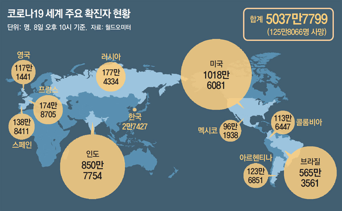 8일 오후 10시 기준 국제 통계 사이트 월드오미터에 따르면 전 세계 코로나19 사망자는 125만 명이다. 유럽 사망자는 29만 명을 넘었다. 유럽 사망자의 3분의 2는 영국 이탈리아 프랑스 스페인 러시아 등 5개국에 집중됐다.