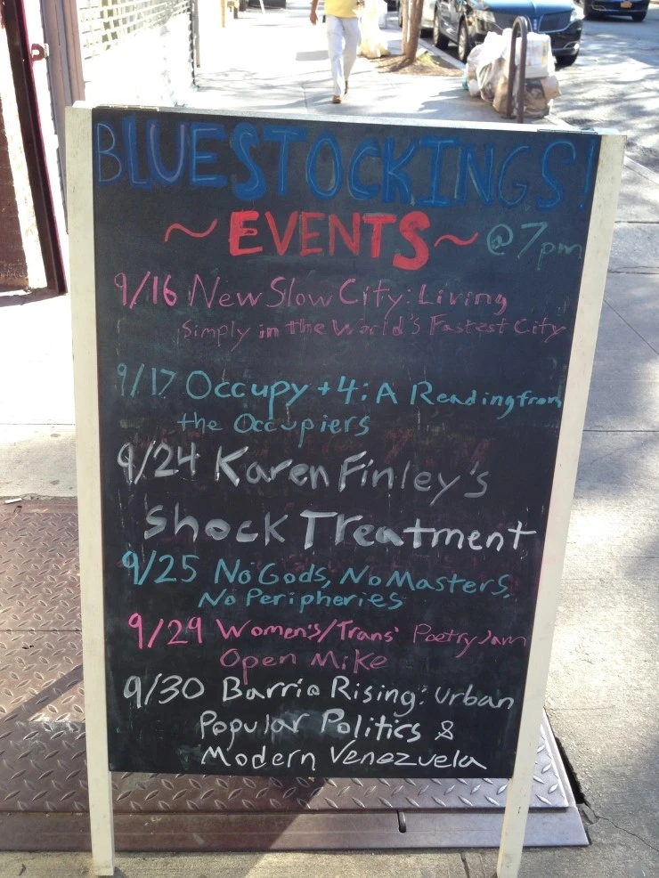 페니미즘과 인종 차별과 글로벌 기후 문제 등 사회 진보에 대한 서적을 전문적으로 취급하는 블루 스타킹은 발런티어가 일을 하고 저렴한 커피 한 잔 먹으며 북까페에서 종일 책을 읽을 수 있으나 북까페는 아주 작고 테이블 몇 개가 고작이다. 책을 좋아하는 토막이 뉴요커들이 일찍 자리 잡고 책을 읽거나 작업을 하는 공간이다. 소호 하우징 웍스 북까페와 가까운 편이나 처음 이곳을 찾을 때 상당히 어려웠다. 로어 이스트 사이드에 위치하고 수많은 이벤트가 열리고 서점에는 다양한 물건들을 판다. 진보주의 책에 관심 많은 자라면 꼭 들려보라고 추천하나 시간이 넉넉하지 않은 여행자라면 굳이 방문하지 않아도 되는 서점이다.
