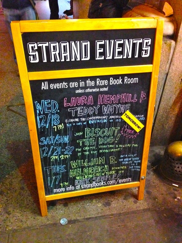 그리니치 빌리지에 위치한 스트랜드 북스토어는 뉴욕 작가, 예술가와 뉴요커 모두 사랑하는 서점이다. 패티 스미스가 잠시 일을 했고 옴베르토 에코와 데이비드 보위도 사랑한 서점이라고. 1927년 오픈한 서점은 18마일의 책을 보유하고 있다고 자랑하는 서점이며 새책, 헌책과 희귀본 모두를 갖추고 있다. 다양한 이벤트가 열리나 단 이벤트는 무료가 아니다. 만약 참가하고 싶으면 저자 책을 구입하거나 아닌 경우 그에 상당한 쿠폰을 구입해야 참가할 수 있다. 서점 앞에 북 이벤트에 대해 적혀 있으며 이벤트 참가 후 저자 사인을 받는다. 지하 1층, 지상 3층으로 되어 있고 1층 서점 밖에는 저렴한 중고책 가판대가 있다. 1-5불 정도 하는 중고책도 많이 보이고 운이 좋은 경우 새책 같은 헌책도 구입할 수 있는 보물섬 서점이며 오페라, 연극, 문학, 미술, 요리, 여행과 문고판 소설 등 다양한 책이 진열되어 있다. 1층에는 베스트셀러 책을 비롯 다양한 섹션으로 구분되어 잘 정리되고 2층에는 예술 서적이 많고 어린이 코너도 마련되어 있다. 커피잔, 가방, 양말, 우산, 티셔츠, 모자 등 다양한 제품을 판매한다. 새책도 일부는 할인하고 2층에 화장실이 있다.